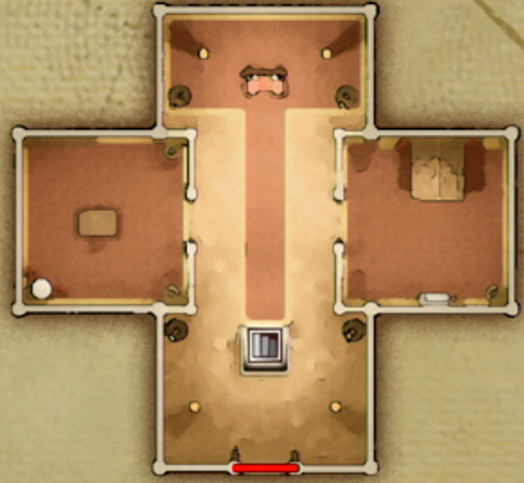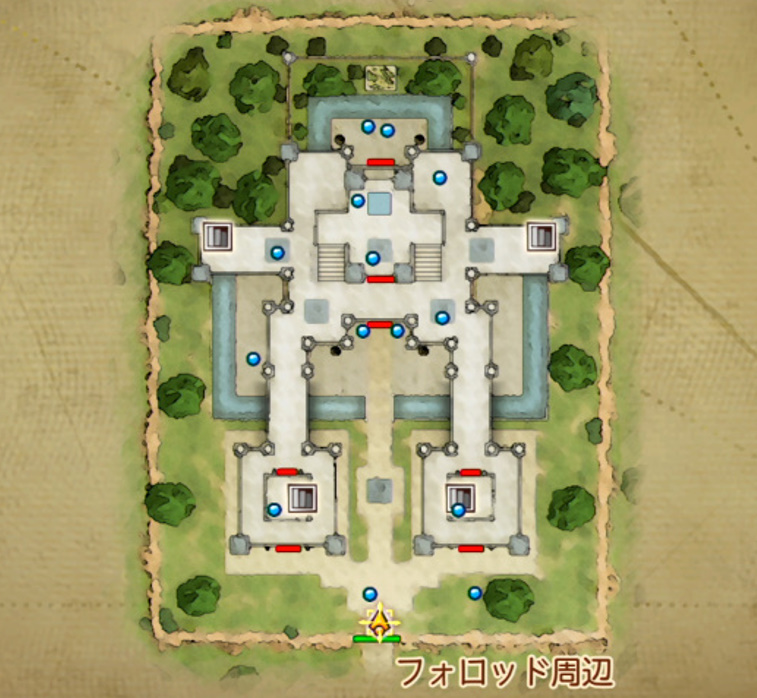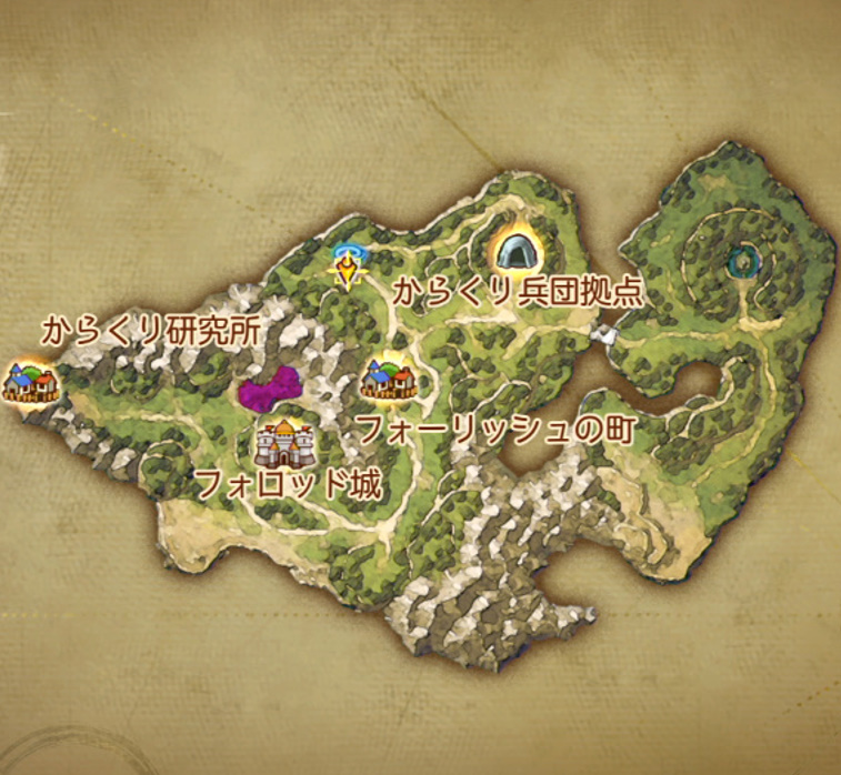 フォロッドの城(過去)はフォロッド地方にあります。現代のなぞの遺跡からふしぎな石版(赤)で。