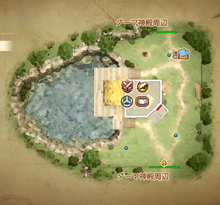 旅の宿(過去)はダーマ地方にあります。現代のなぞの遺跡からふしぎな石版(青)で。