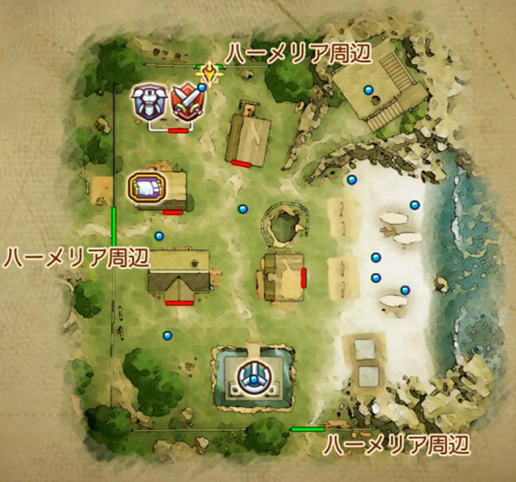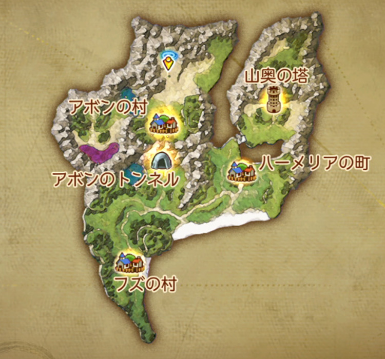 フズの村(過去)はハーメリア地方にあります。現代のなぞの遺跡からふしぎな石版(青)で。